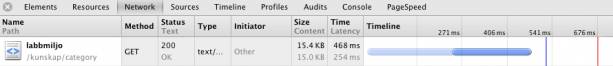 Innan jag dyker ned i koden så analyserar jag utfallet av laddningstiderna via Chromes utvecklingsverktyg. Jag ser direkt att jag kan utesluta problem med nätverket och laddningstider för andra resurser kopplade till sidan (bilder, stylesheets och javascript). Man kan se att det är en stor latency för testfall 2 och 3, själva laddningstiden av sidan över nätverket är försumlig. Det är latency-tiden som skiljer sig mellan testfallen, det är alltså den tiden som anropet spenderar på server-sidan innan den får svar.