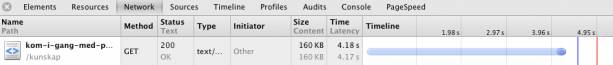 Det tog mig lite tid att hitta “rätt” testfall och jag fick testa en hel del olika länkar för att se var problemet (problemen) låg. Men, om vi nu tittar i tabellen så ser vi att jag lyckats isolera två testfall (4, 5) som har fullt acceptabla laddningstider och två testfall (2, 3) som har riktigt usla laddningstider. Det är bra. Nu kan jag fokusera min felsökning på testfall 2 och 3. Eftersom testfall 4 och 5 är fullt acceptabla så är det något problem med just innehållet som laddas i testfall 2 och 3.